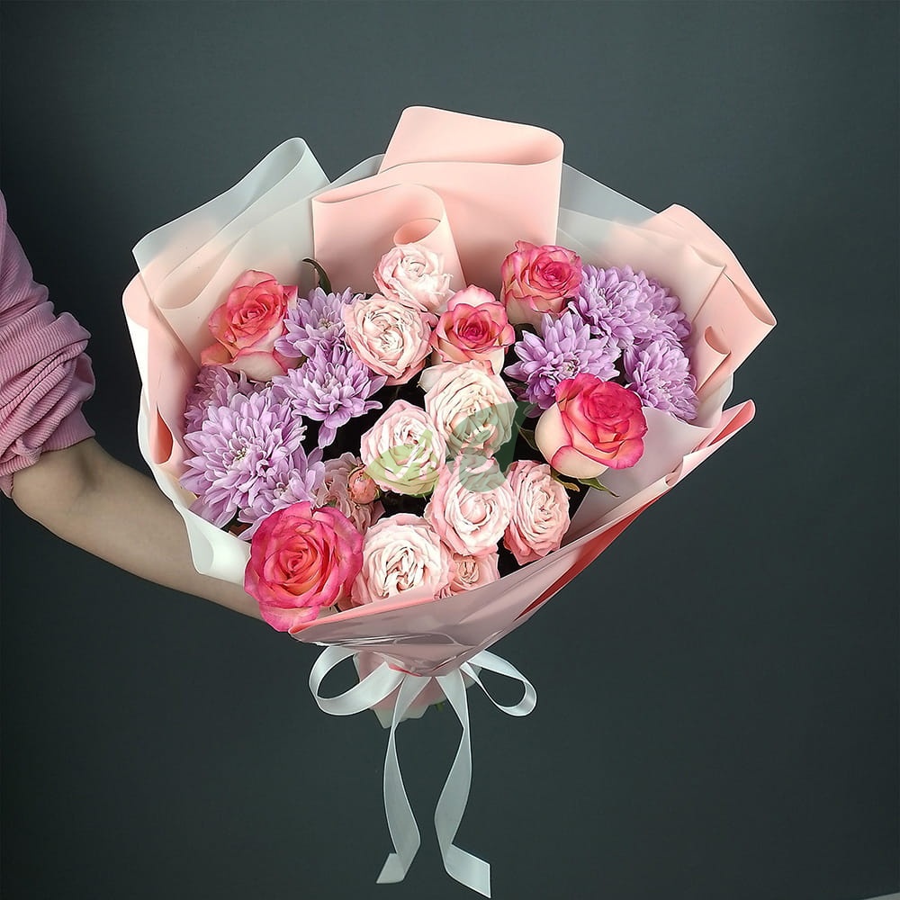 Состав и характеристики букета из кустовых роз и хризантем "Тёплые объятия":